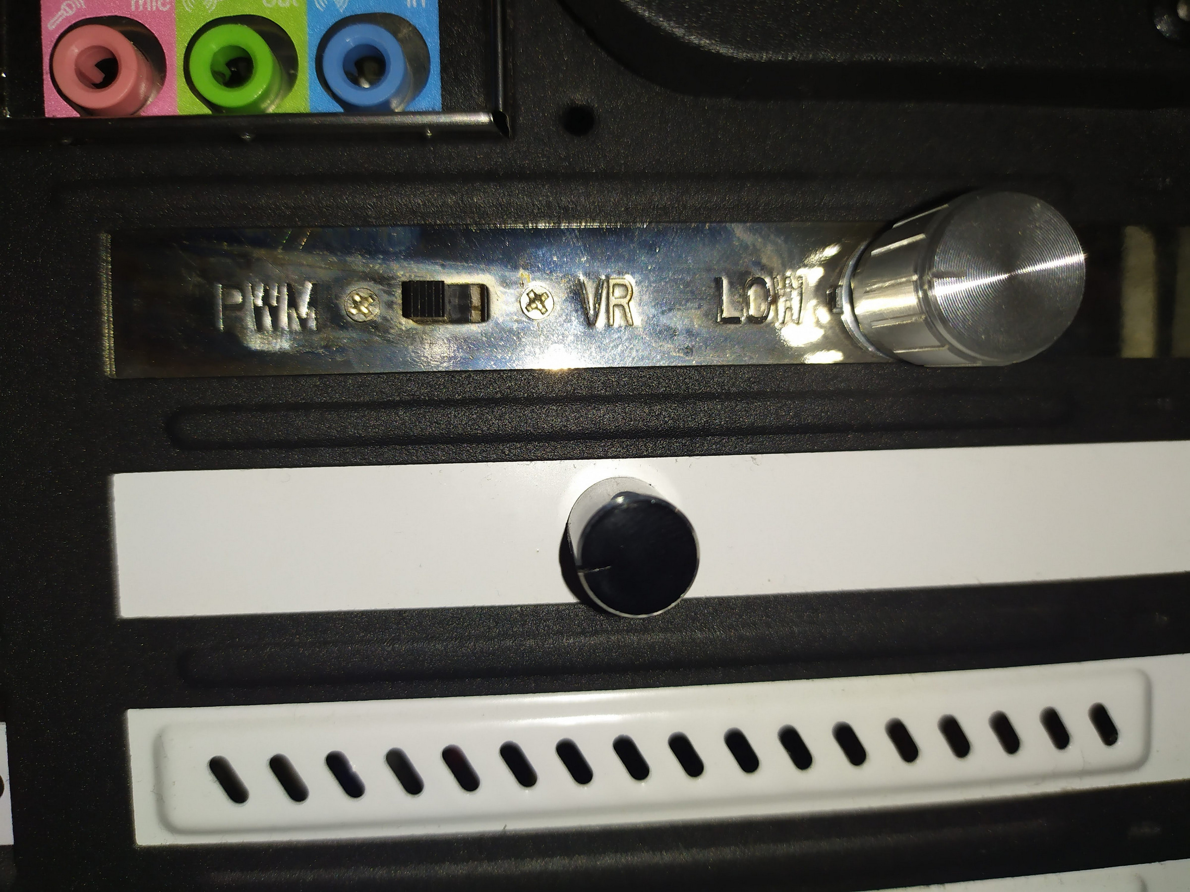 Außerdem noch: hinten sind noch 2 Drehregler und ein Schalter. Ich habe keine Ahnung mehr, wofür das gedacht ist... Die obere Einheit hat nach dem Ausprobieren was mit dem Kühlerlüfter der CPU zu tun. Scheinbar kann man hier seine Umdrehungszahl regeln. PWN und VR sagt mir dagegen gar nichts.