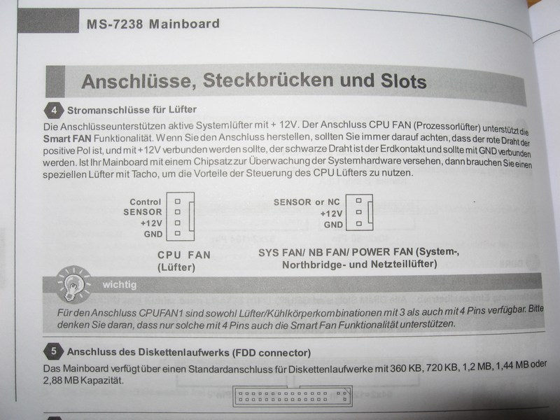 Hmm ... es liest sich so, als könnte das Mainboard/BIOS nur einen Lüfter mit einem PVM-Anschluss (4pol) steuern. Gibt es bei dir im BIOS beim Hardware Monitor (o. ä.) auch die Möglichkeit, die Lüftersteuerung "SMART FAN" auch per "Voltage" regeln zu lassen? Dann klappt es auch mt einem 3-pin-Lüfter