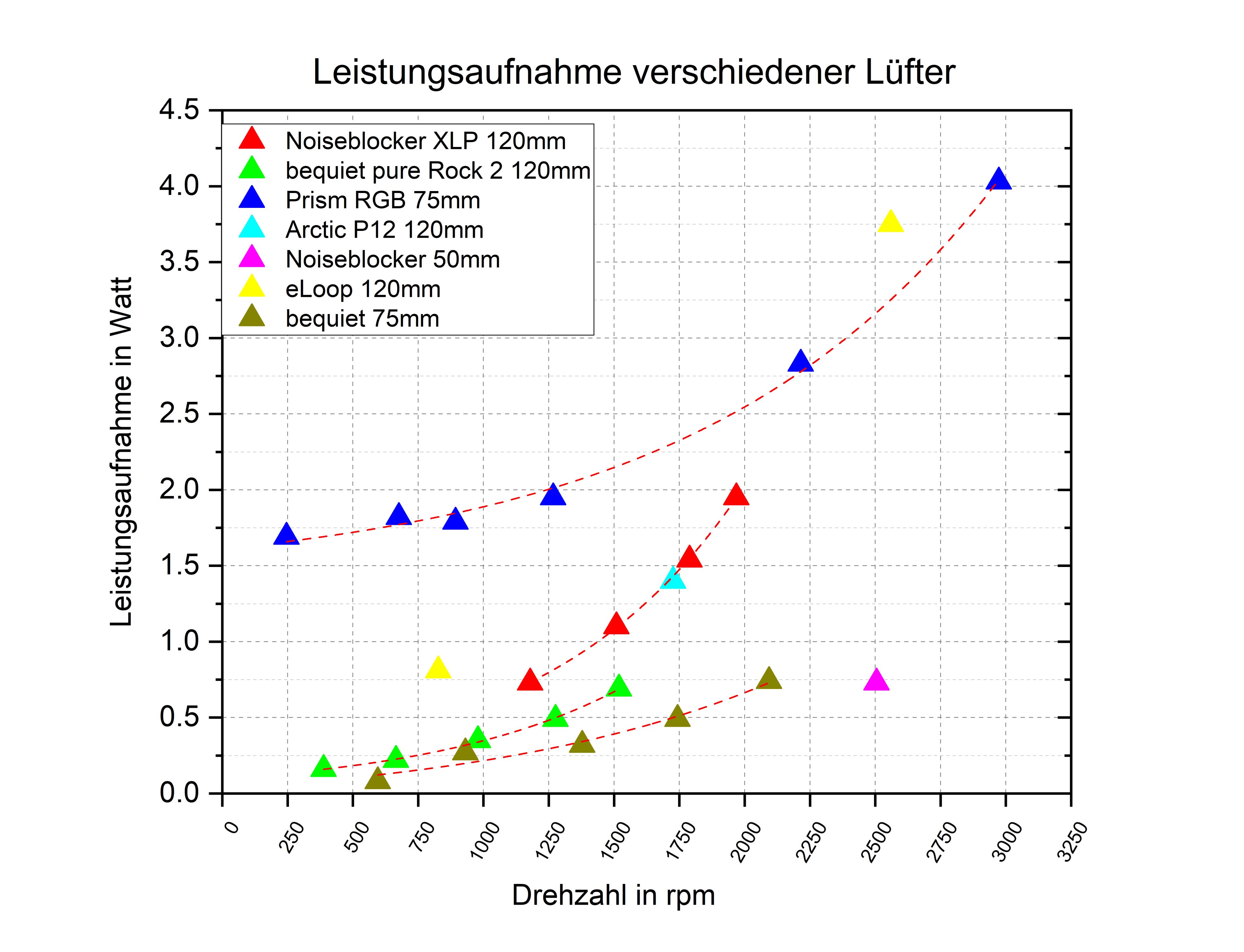 Die Leistungsaufnahme kann aber auch bei Lüftern stark ansteigen sobald Drehzahl und Gegegndruck hoch gehen.