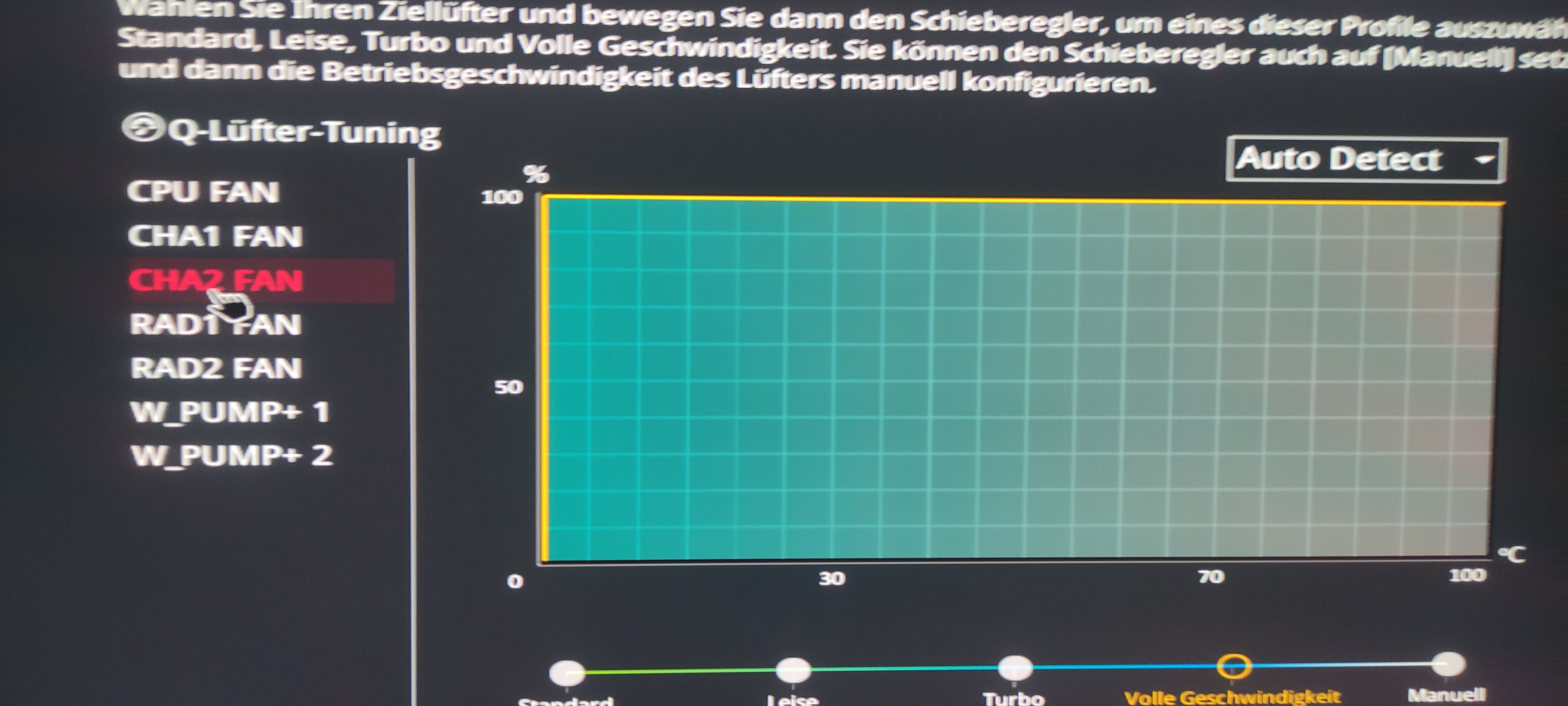 ich habe mir einen neuen Pc zusammen gebastelt. Soweit so gut, da liefen alle 10 Lüfter über den Fan/A-Rgb Hub (Angeschlossen an dem Cha Anschluss des Mainboards). Jetzt lag bei dem Hub eine Fernbedienung bei und ich habe dort halt einige Sachen ausprobieren wollen. Ich drückte also auf - Speed und auf einmal waren alle Lüfter aus. Das Problem ist nun das sich kein Lüfter mehr dreht und auch wenn ich auf + Speed drücke wie ein Irrer kommt da kein Lüftchen. Zieh ich den PWM Stecker ab, bekommen alle Lüfter Strom und drehen auch voll auf. Klar ist auch Strom drauf (Sata Strom Kabel). Also hab den Hub und alles was damit zusammen hängt getrennt und einen einzelnen Lüfter an die Anschlüsse Cha 1 und Cha 2 dran gemacht. Nun das gleiche Problem. Lüfter leuchtet wie ein Pferd was die Rgb Sachen gefuttert hat, aber es dreht sich eben auch nichts. Im übrigen falls jemand nach der Aio fragt, der geht es gut und läuft auch nicht über den Hub. Im Bios wird nur die Aio erkannt. Es geht also nur um die Gehäuselüfter und die beiden Anschlüsse am Mainboard. Kann mir da jemand bitte helfen, denn ich habe keine Ahnung mehr was ich machen soll.