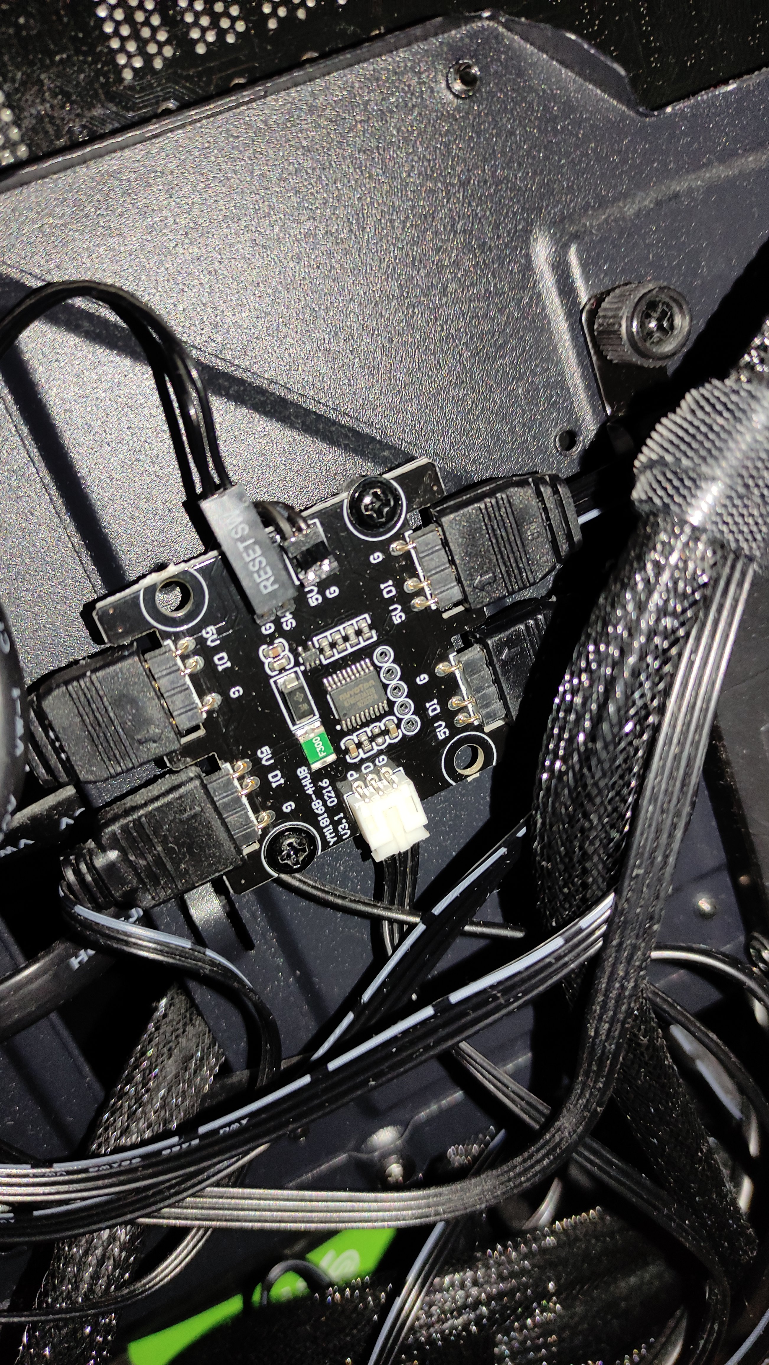 Wenn ich die Lüfter einzeln an das Mainboard anstecken würde, leuchten sie auch, jedoch hat das Mainboard nur einen RGB LED Header, deshalb müsste ich das mit der Lüftersteuerung machen.