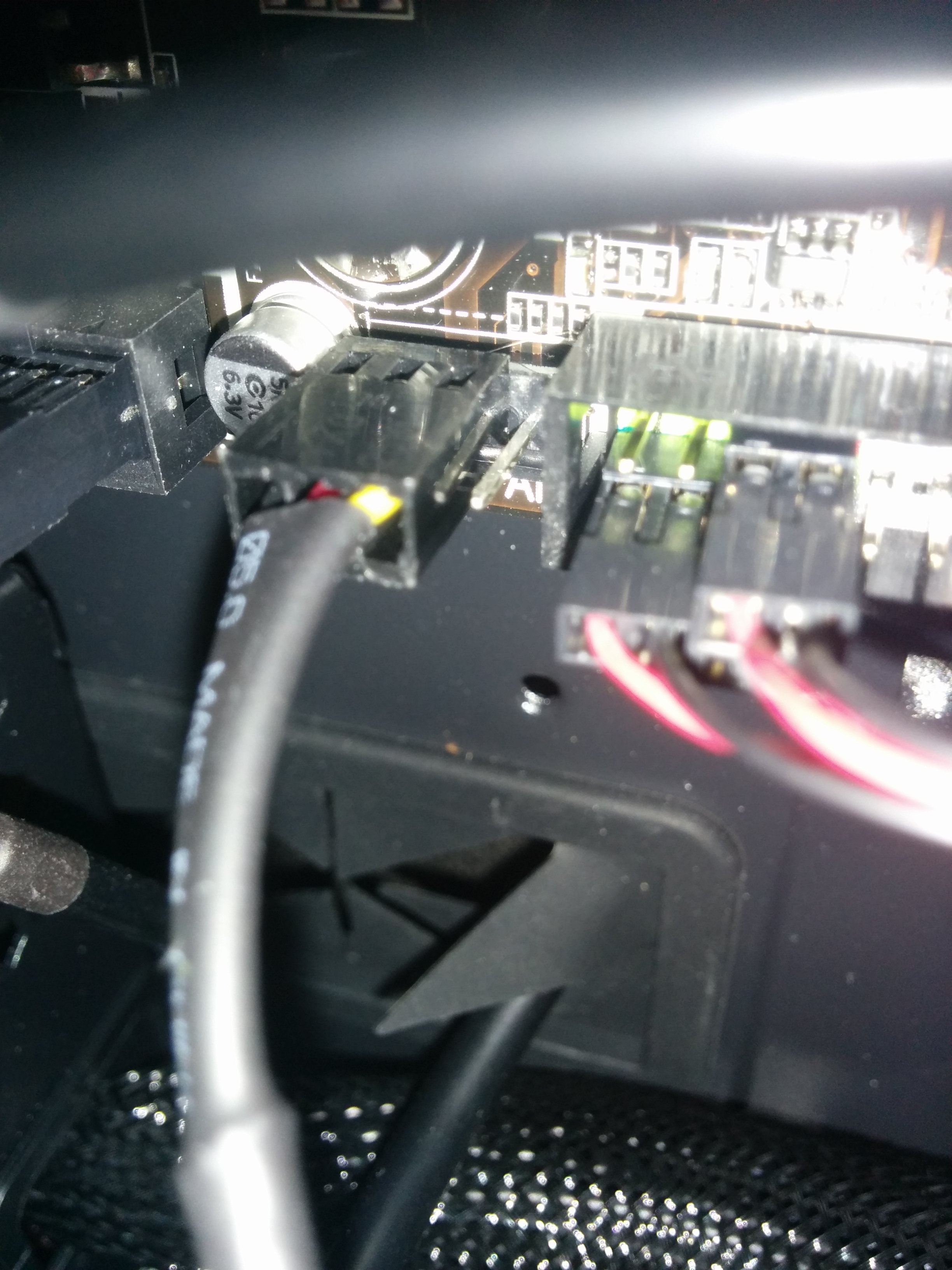 Da ich genug Lüfter verbaut habe müssen diese auch nicht mit voller Leistung laufen. Daher habe ich den unteren vorderen Lüfter über ein 7V Adapter direkt ans Netzteil angeschlossen und der obere vordere Lüfter hängt am Fan des Mainboard.