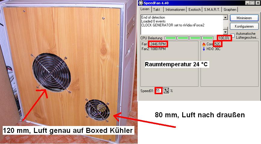 ich hab mir heute meinen PC zusammengebaut und wollte noch ein paar Kleinigkeiten klären, mir wurde damals beim zusammenstellen der Scythe Mugen 2 empfohlen. jetzt meine fragen... brauch ich den cpu-lüfter unbedingt... mom hab ich den boxed der mit offenen gehäuse nach 5 min sich bei 35-36 grad einpendelt, wenn ja, ist der genauso leicht wieder boxed zu montieren? und meine letzte frage ist, ich will noch einen lüfter vorne in mein antec 300 einbauen, jetzt die frage, wenn ich einen noch vorne einbaue (ggf. auch seitlich) um wieviel °C senkt sich dann ca. die temp der graka und der cpu (hab irgendwie keine lust, den cpu lüfter zu tauschen, da es sich wohl schlecht machen wird den kühler im nachhinein zu tauschen, wegen der kabel).
