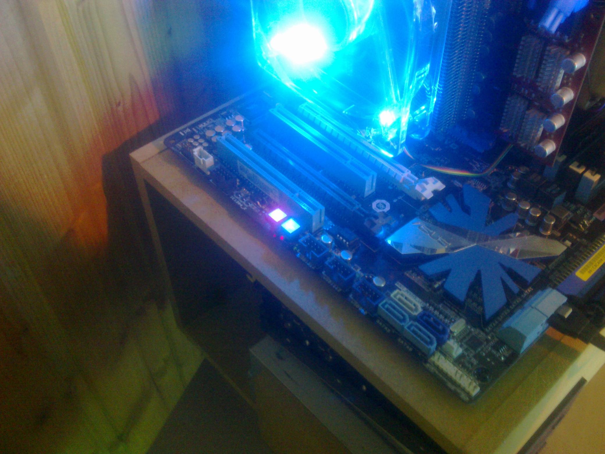 Ich kann jetzt nicht genau erkennen in welche Richtung der CPU-Lüfter bläßt, aber der sitzt auf jeden Fall falsch. Entweder bläßt der ins Gehäuse rein, oder er "zieht" die Luft duch den Kühler, was auch nicht optimal ist.