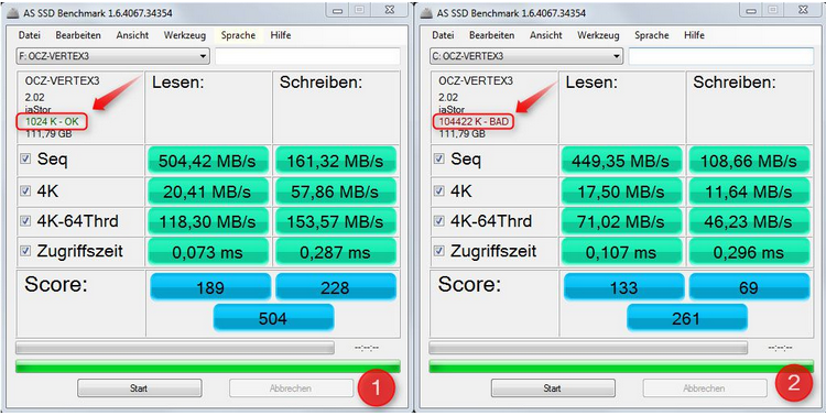 ich habe vor kurzem die Festplatte eines Windows 7 Rechners auf eine SSD geklont und nach dem das System einwandfrei lief einen DiskSpeedtest gemacht. Dabei musste ich feststellen, dass die SSD nur die hälfte der Geschwindigkeit ihrer Werksangabe erreicht.