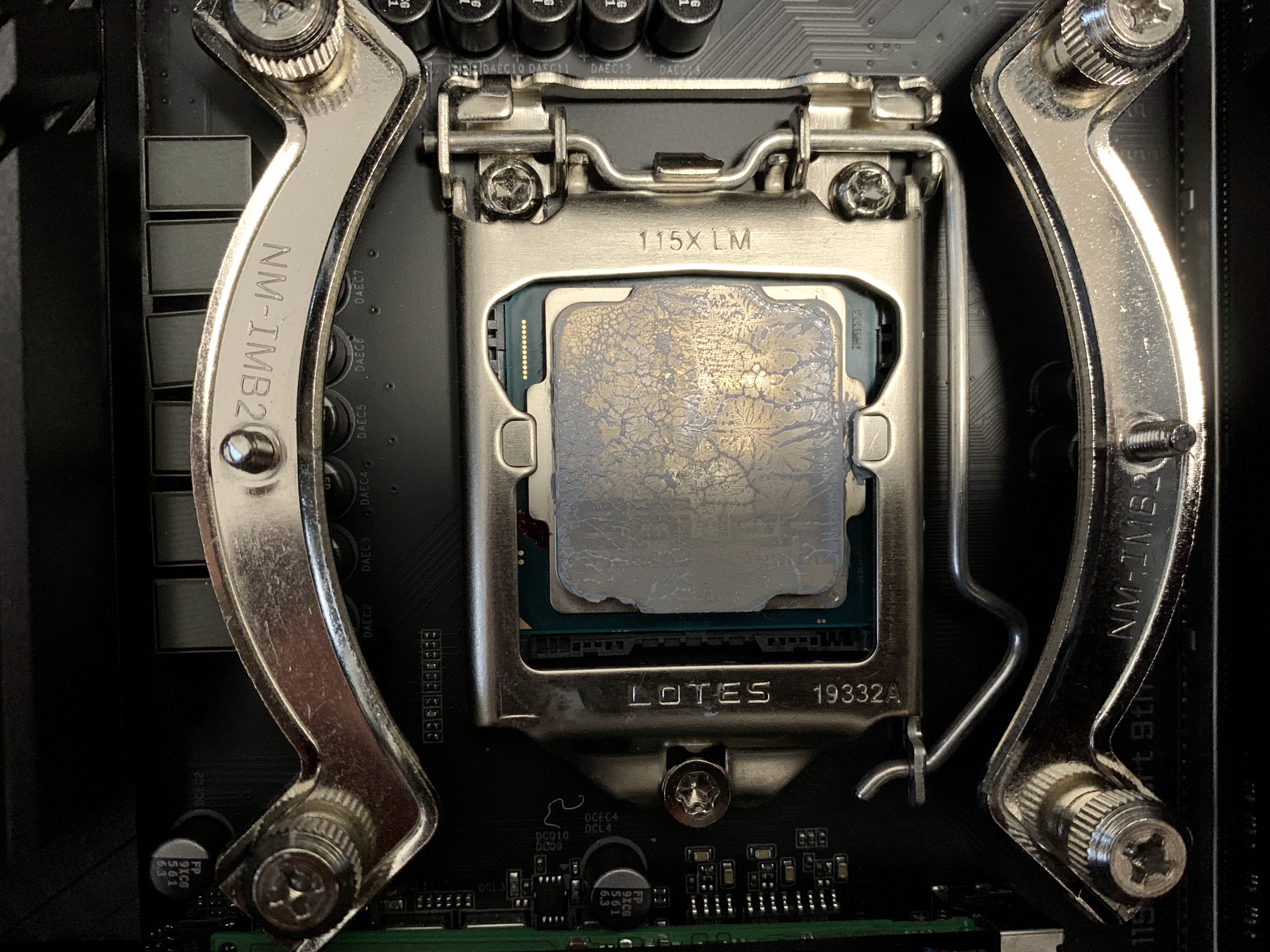 Die Wärmeleitpaste ist ordnungsgemäß aufgetragen, es handelt sich um eine Noctua NT-H2 und sie ist über die kompletten Heatspreader verteilt. Ich benutze immer die gleiche Methode. Habe ein Foto angehängt.
