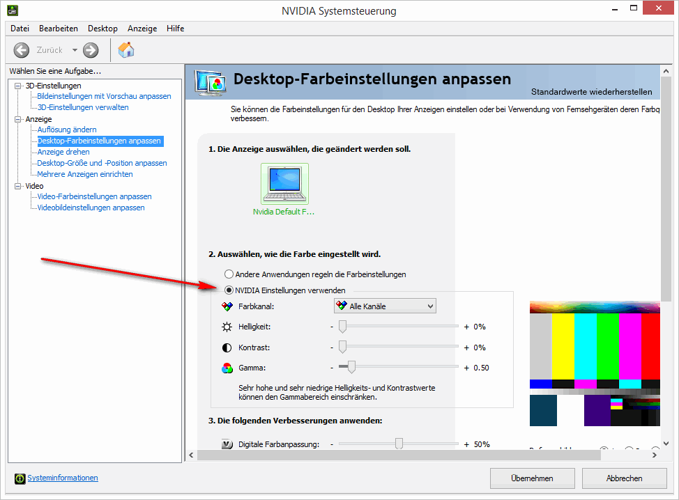 Allerdings wird beim Start nach Stromunterrechnung (also Netzstecker ist gezogen) der Nividia-Treiber nicht geladen, sodass der rudimentäre Windowsstandard-Treiber geladen wird und der Bildschirm auf Hell steht. Erst wenn ich in das Nvidia-Control-Panel gehe und auf "Nvidia-Einstellungen verwenden" klicke, wird der Bildschirm nach meinen Einstellungen abgedunkelt. (siehe Screenshot)