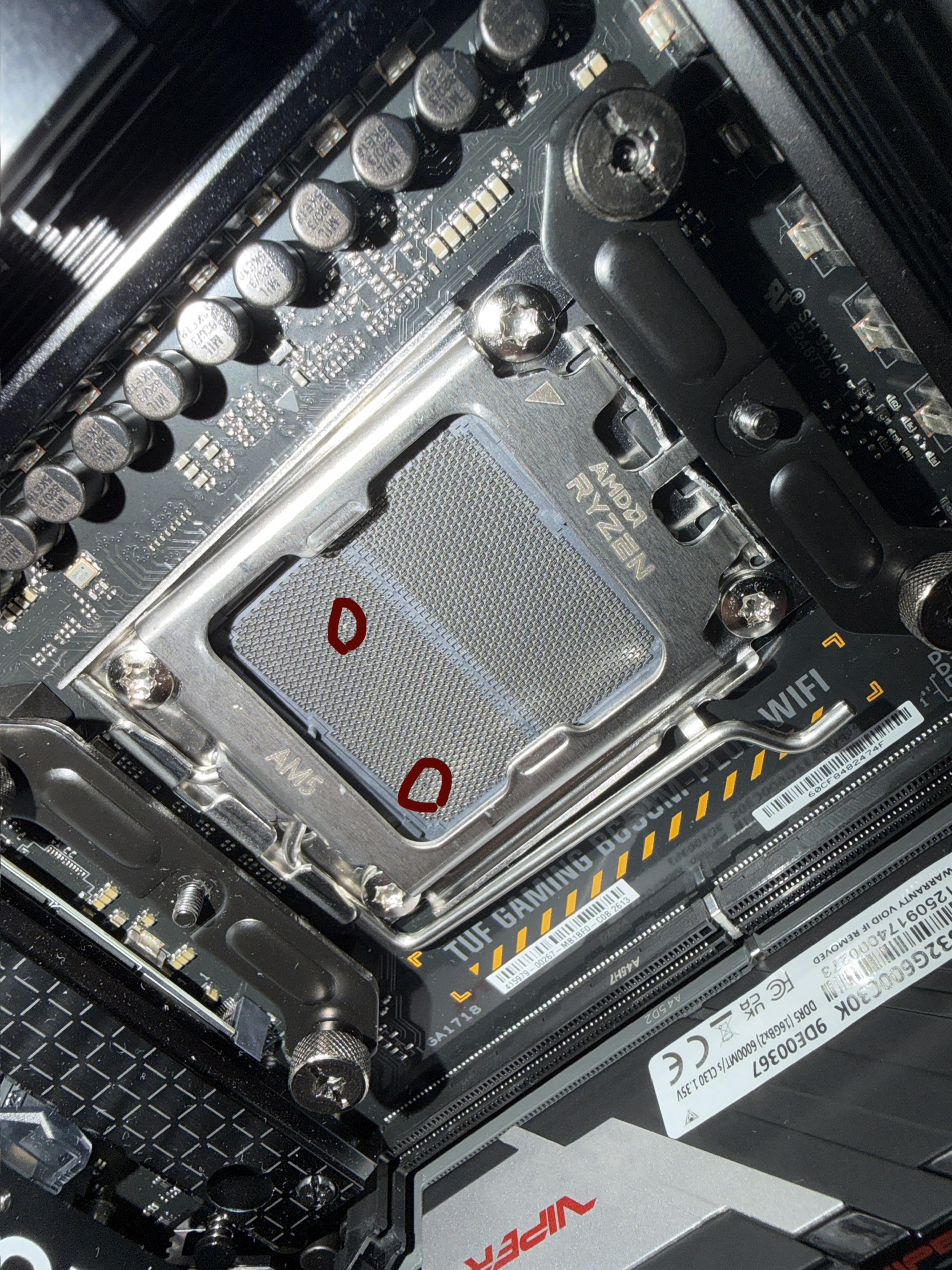 Hatte dann CPU Kühler gelöst und nochmal CPU neu eingesetzt und mit neuer Wärmeleitpaste versehen. Und Kühler wieder angeschlossen. Bei dem AM5 Sockel sahen 2 pins komisch aus und fühlten sich nicht wie die anderen an. Ich hab ein Foto angehangen! Die CPU sah einwandfrei aus!