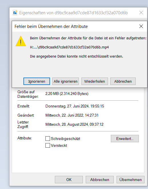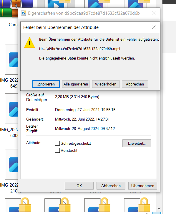 wie auf dem Foto zu sehen haben von einem alten Foto Backup von damals auf der externen HDD die Fotos ein gelbes Schloss und lassen sich nicht öffnen. Ordnerfreigabe mit Vollzugriff hilft auch nicht. Betrifft jedenfalls nicht alle Backup Ordner auf dieser HDD.