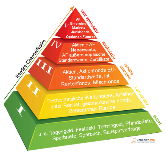 Elfhelm, bei der Pyramdie bekomme ich Bauchschmerzen und die Einschätzung der Risiken dort halte ich für überholt, die mag Jahrezehnte gestimmte haben, aber schon wer 100 Jahre zurück blickt, muss zu einem anderen Urteil kommen, denn da war manches was dort als Sicher eingesuft wird, praktisch ein Totalverlust. Und wenn ich dann Mischfonds lese, dann hat da jemand die Kosten mal wieder außer Acht gelassen, aber wenn man 2% Verwaltungsgebühren für einen Fond bezahlt und noch mal das Gleiche für den Dachfonds, dann bleibt einfach am Ende für den Anleger nichts übrig, das ist leider so, aber die Banken verkaufen es deswegen umso lieber, weil die ja einen Teil der Gebühren einstreichen, während ein Depot nur wenige Euro pro Jahr kostet und für den An- und Verkauf von Aktien nur einige Euro Ordergebühren fällig werden. Dafür gibt es im DAX noch immer durschnittliche 3% Dividendenrendite und von Emering Markets und vor allem allen Derivaten, also Aktienanleihen, Optionen, Futures und Zerfifikaten sollte man sich fernhalten, da es nur Inhaberschuldverrschreibungen sind, also nur ein Versprechen auf künfitge Zahlungen, wie auch alle Bankeinlagen und Rentenpapieres, also Anleihen.