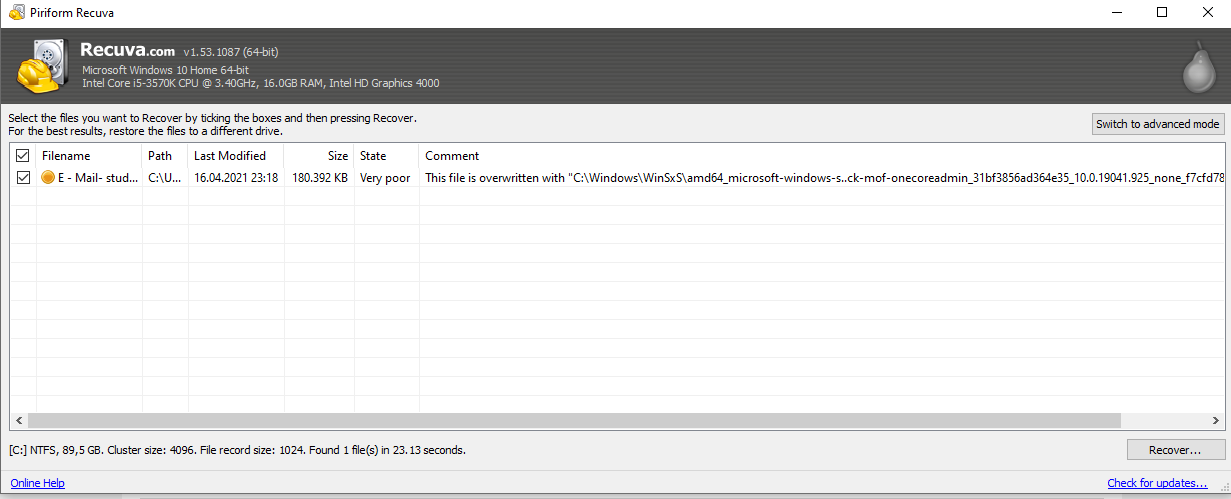Ich habe den MP3-Stream (128 kbit/s) eines Radiosenders aufgenommen, eine dreistündige Sendung, und wollte diese schneiden, und zum unterwegs anhören auf's Handy kopieren. Leider habe ich die Aufnahme (ausnahmsweise) direkt danach gelöscht, und wenige Stunden später festgestellt, dass ich stattdessen die Aufnahme von der Vorwoche erwischt, und nochmal geschnitten und kopiert, und unter neuem Namen ein zweites Mal abgespeichert hatte. Ich habe sofort versucht, die gelöschte Datei mit Recuve wiederherzustellen. Das Programm zeigte (mit und ohne Tiefenscan) schon nach kurzer Suche genau diese eine Datei an, aber mit dem Status "Very poor", da sie von einer anderen Datei "C:\Windows\WinSxS\amd64_microsoft-windows-s..ck-mof-onecoreadmin_31bf3856ad364e35_10.0.19041.925_none_f7cfd7808dd5c05a\fastprox.dll" überschrieben wurde.