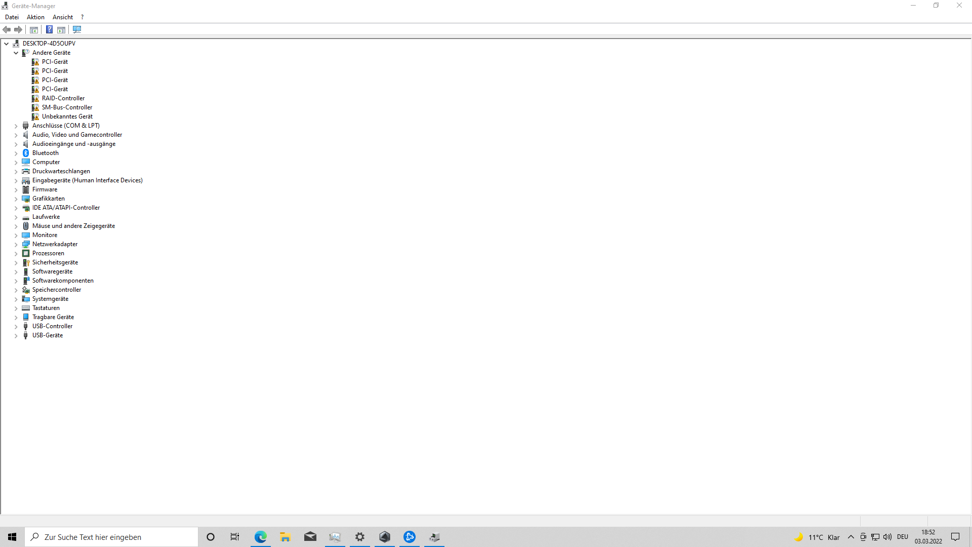 Im Geräte Manager habe ich bei 4 PCI-Geräten, beim Raid-Controller, beim SM Bus Controller und bei einem Unbekanntem Gerät ein oranges Fragezeichen.