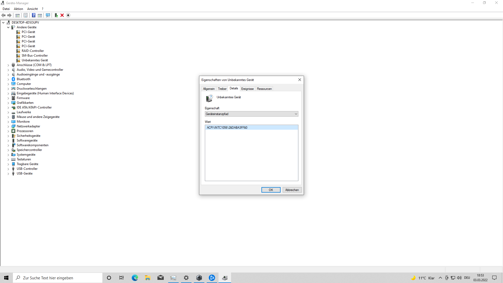 bei dem Unbekannten Gerät habe ich bei den Eigenschaften unter Details gesucht habe etwas gefunden aber konnte es leider nicht entziffern. (ACP\INTC\1056\2&DAB3FF&0)