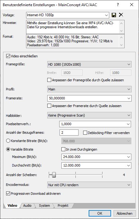 Benutzerdefinierte Vorlage basteln. Du hast aktuell die „HD-1080-30p-Video mit 8 Mbit/s (*)“ drin.