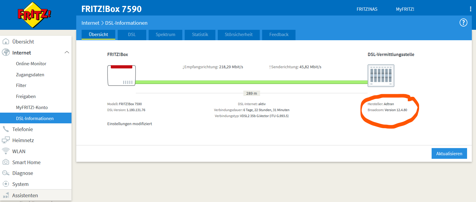 seit meine FRITZ!Box 7530 gestern Nacht auf Version 07.28 geupdatet hat, ist die Datenrate deutlich geringer als normal. Bis gestern hatte ich stabile 50/10 Mbit/s anliegen, jetzt sind es knapp 10/1 Mbit/s.
