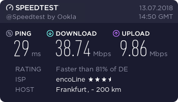 Eine kleine Anmerkung noch vor ca. einem halben Jahr war ich noch bei der deutschen Telekom (gleicher Anschluss) mit ebenfalls 50mbit/s down und 10mbit/s up ohne All IP, hier war die maximale Downloadrate bei Speedtests etwas schlechter (ca 1-2 Mbit/s) aber dafür in Downloads von größeren Dateien wesentlich konstanter und nah am Maximum.