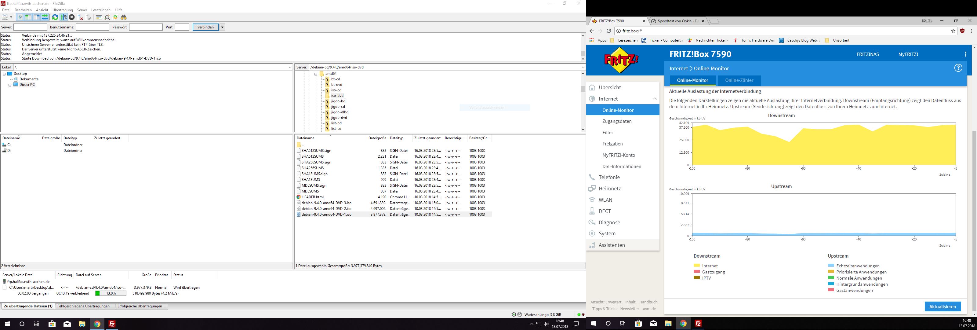 Falls ich größere Dateien (z.B. von Computerbase.de oder bei Steam) herunterlade, schaffe ich im besten Fall 43 mbit/s, durchschnittlich eher 32 bis 38mbit/s. Weiterhin baut sich zu Beginn eines Downloads die Downloadgeschwindigkeit nur sehr gemächlich auf und schafft es dann nicht konstant hoch zu bleiben.