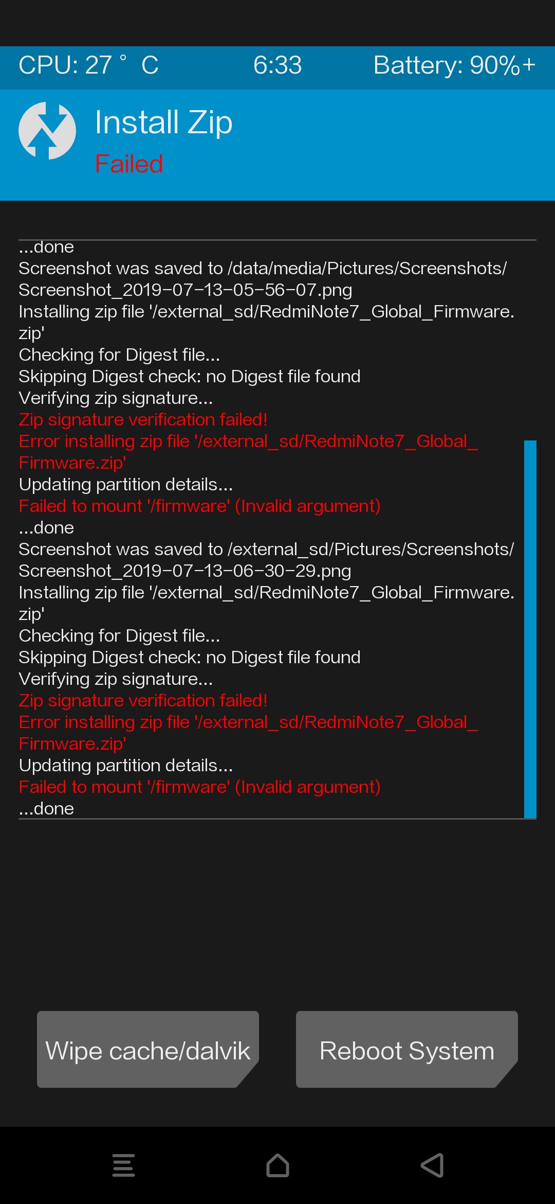 Failed to mount /firmware (invalid argument). Und ich kann die Firmware nicht als zip installieren. Vorher lief das Handy ohne Probleme. Auch mit der offiziellen Firmware lässt sich das Gerät nicht flashen. Woran kann der Fehler liegen?