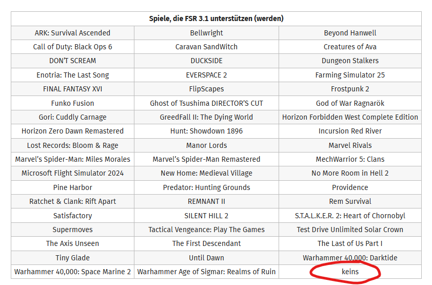 Stand heute bekommt Cyberpunk kein FSR 3.1, soweit ich mitbekommen habe.Rockbreak schrieb:Vielleicht war das Cyberpunk, fehlt nämlich auf der Liste