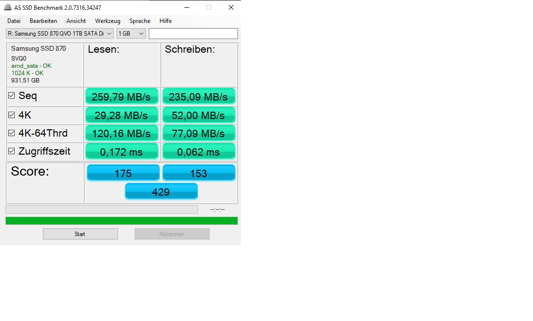 Abseits der Anbindung, musst Du ebenfalls beachten, dass die Leistung der 870 QVO noch deutlicher abfallen kann, nämlich unter 80 MB/s Schreibgeschwindigkeit: