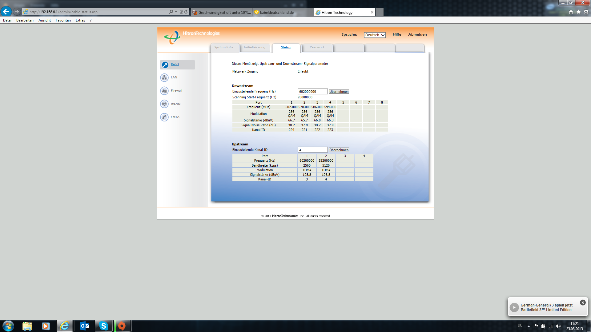 Verwende ein Samsung Laptop mit WLan, also WLan-Router hab ich von KD einen Hitron und gebucht ist theoretisch eine 16000er Leitung.