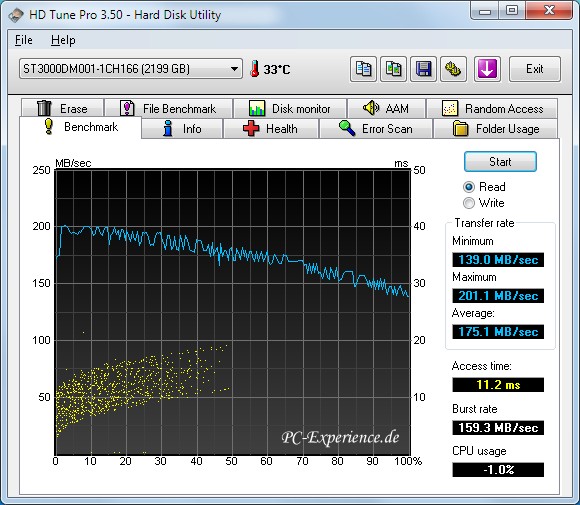Ich musste aber feststellen, dass bei HDTune Pro 5.5, die Minimale Leseleistung bei rund 93 MB/s liegt. Bei diversen Benchmarks auf etlichen Internet Seiten wird aber von ca. 130 - 133 MB/s Minimale Leseleistung gesprochen.