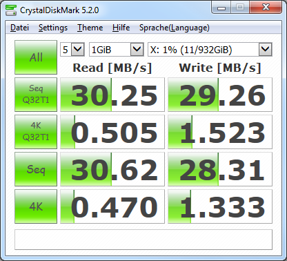 Nun habe ich die Geschwindigkeit mit CrystalDiskMark getstet und die Werte erscheinen mir viel zu niedrig: