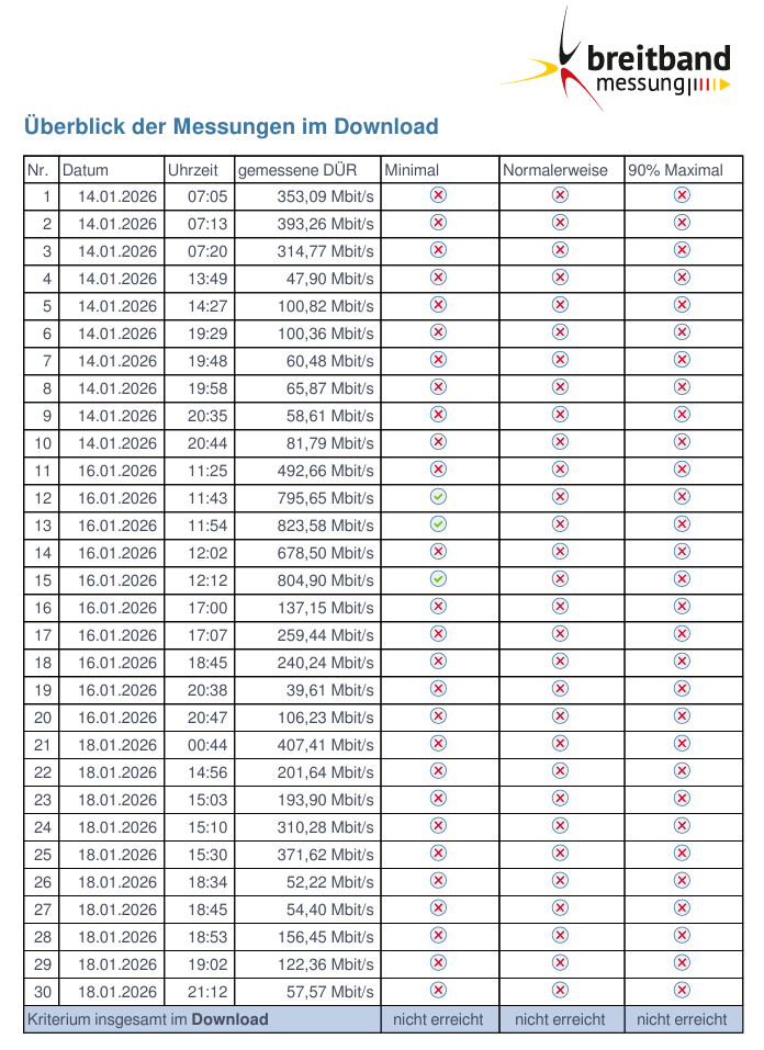 "Es wurde eine "erhebliche, kontinuierliche oder regelmäßig wiederkehrende Abweichung derGeschwindigkeit" von Festnetz-Internetzugängen i.S.v. § 57 Abs. 4 Satz 1 Nr. 1 TKG entsprechendder Allgemeinverfügung 99/2021 der Bundesnetzagentur festgestellt.Bitte wenden Sie sich bezüglich der festgestellten Abweichung mit dem Protokoll an Ihren Anbieter.Weitere Informationen zum Thema finden Sie im Verbraucherportal der Bundesnetzagentur"