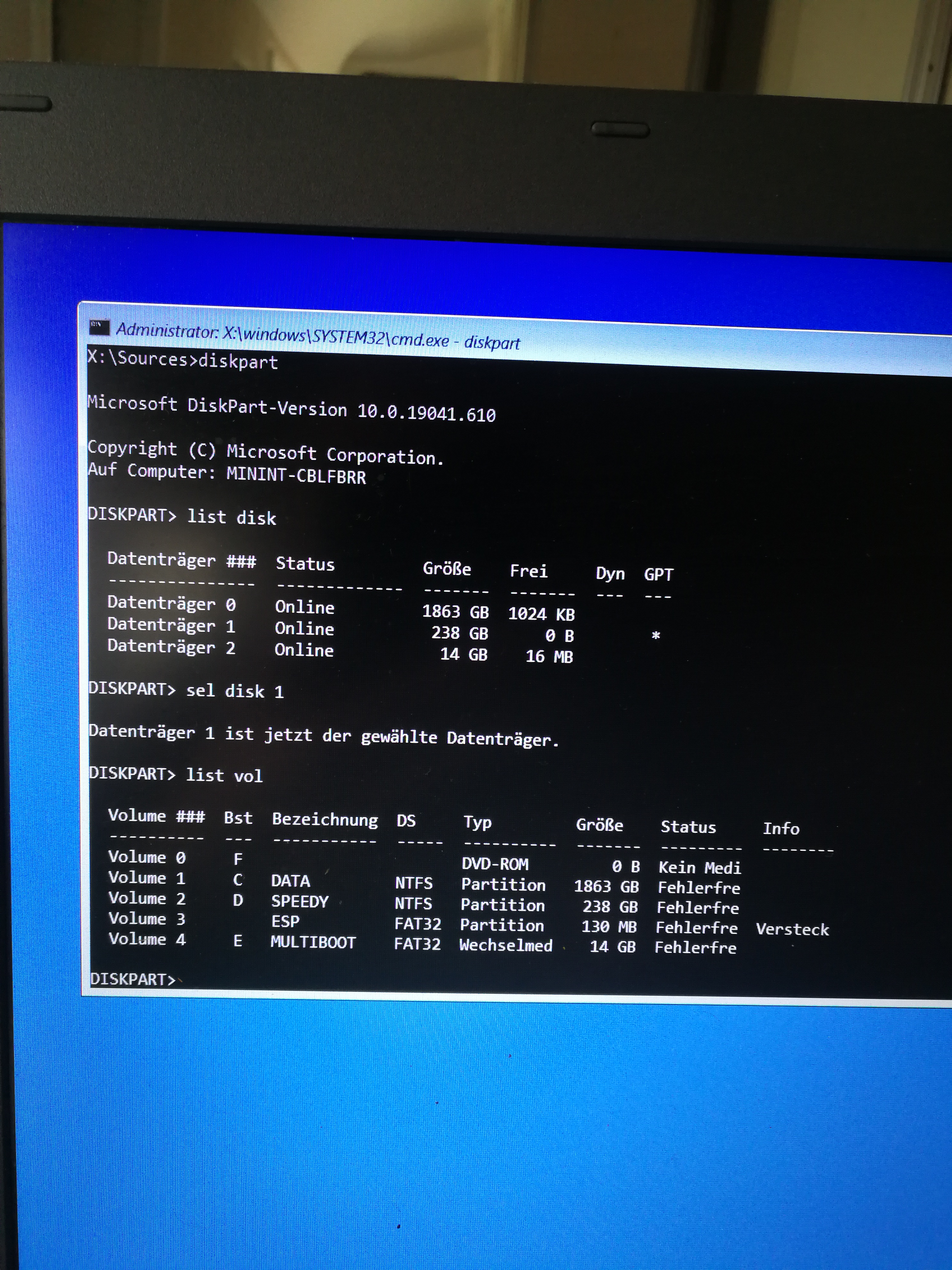 Also wir reden hier ueber ein Acer Aspire Notebook mit aktueller Windows 10 Pro Installation, UEFI Bios, einer 250 GB SSD, auf der Windows installiert ist (SPEEDY) und einer 2 TB SATA fuer die Daten (DATA).