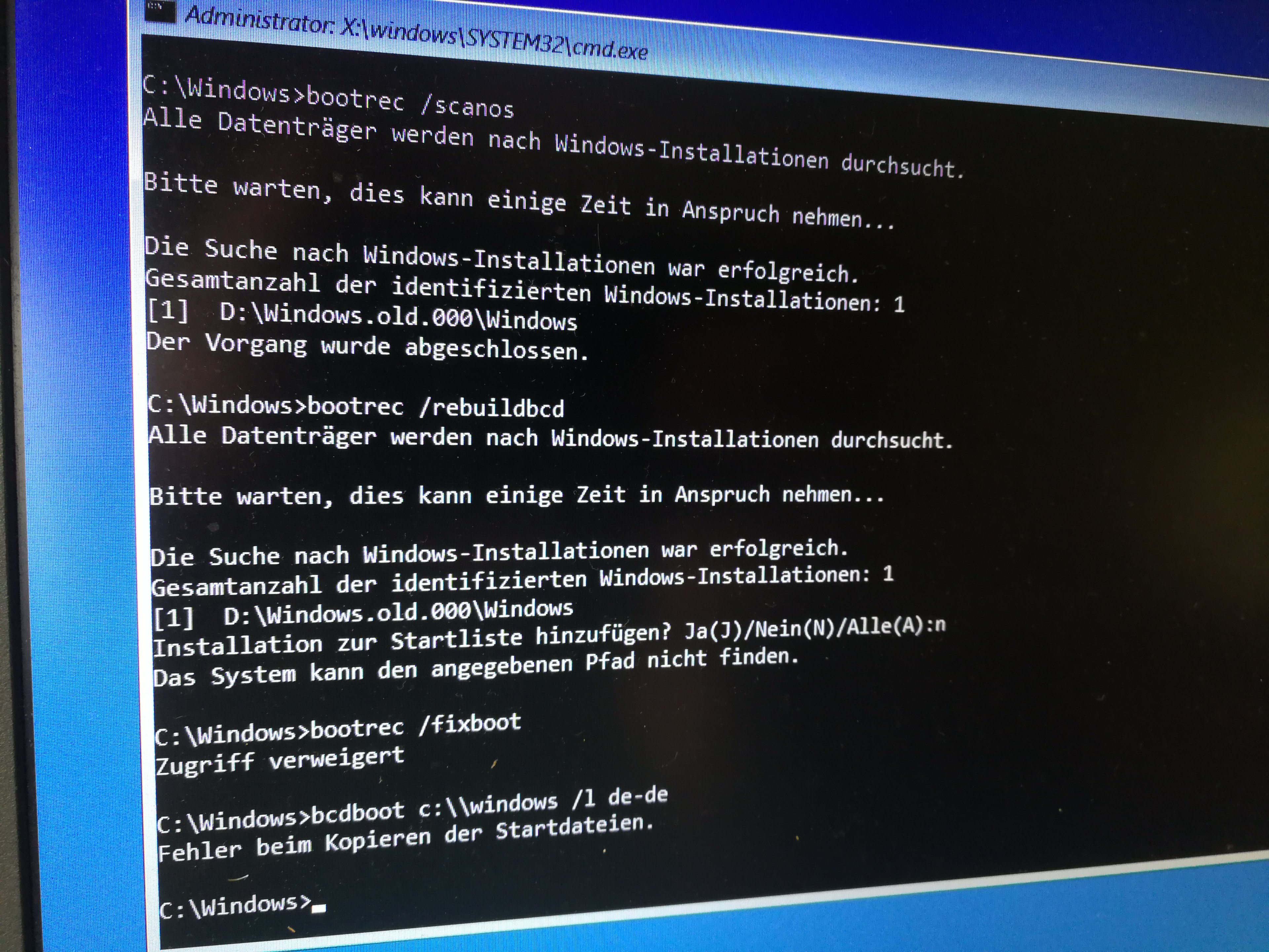 Was mich stutzig macht, ist, dass weder /scanos noch /rebuildbcd die eigentliche Windows-Version findet, sondern lediglich eine alte auf D: gesicherte Windows.Old, bei der er dann letztendlich auch den Pfad nicht findet.