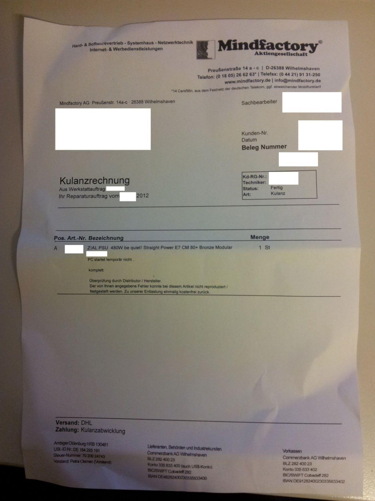 ich habe mein Netzteil (be quiet! Straight Power CM 480W E7) auf Grund eines defekts (siehe unten) zu Mindfactory eingeschickt. Nun habe ich folgen Antwort bekommen: