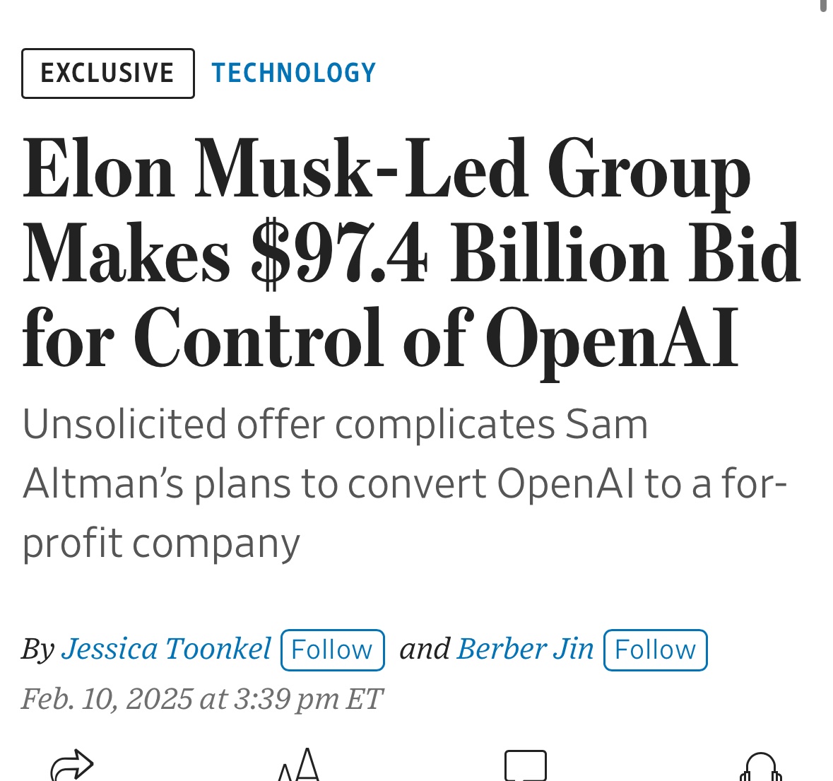 „A consortium of investors led by Elon Musk is offering $97.4 billion to buy the nonprofit that controls OpenAI, upping the stakes in his battle with Sam Altman over the company behind ChatGPT“