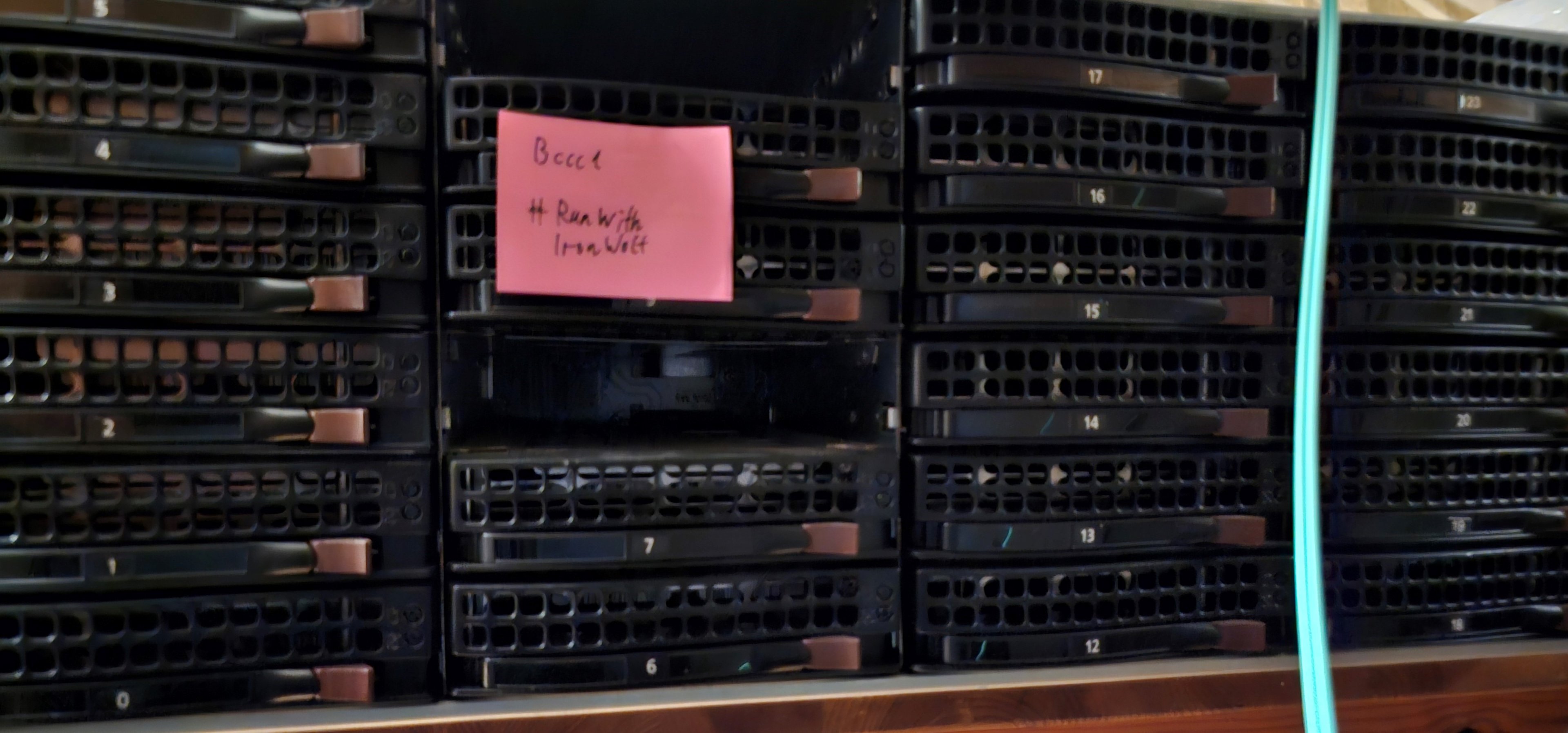 Das Bild ist mein Backup System und gerade zur Wartung offline, war einfacher zu fotografieren als das haupt NAS, das eh identisch aussieht. Beides Whitebox Builds mit TrueNAS CORE, auf dem Backup System Baremetal, auf dem produktiven System in ESXi.