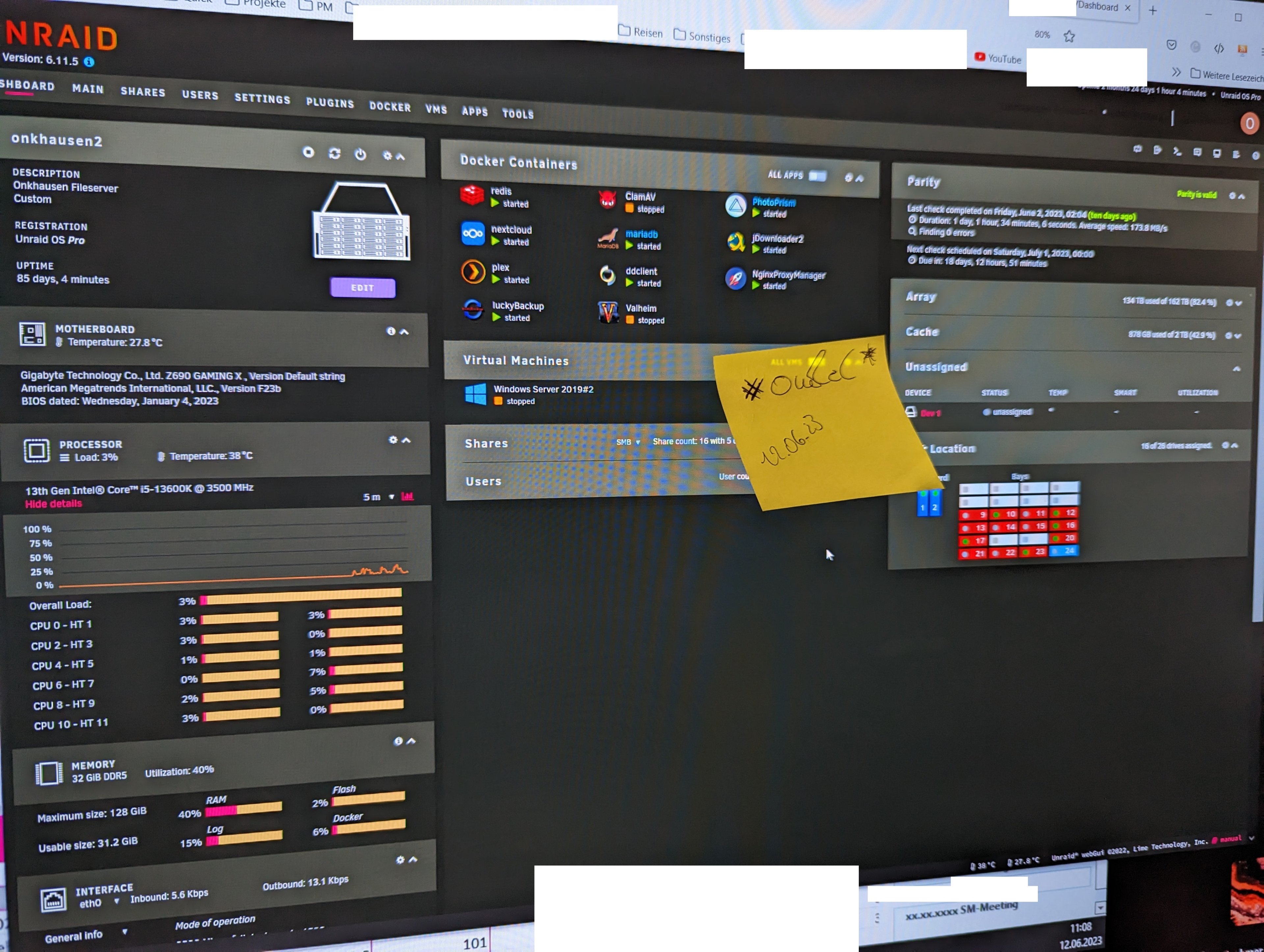 ist ein AMD Ryzen 3 2200G mit 2x8 GB DDR4-3200 auf einem MiniITX-Board mit B450-Chipsatz, 256 GB NVMe-SSD für das System und 3x 4 TB SATA-SSDs als RAID5. Darauf läuft Debian 11 (Debian 12 ist noch nicht mit OpenMediaVault kompatibel) mit OpenMediaVault, miniDLNA und pi-hole. Er hat eine 2.5 GBit LAN-Karte, die an einem QNAP 5-Port 2.5 GBit Switch hängt.