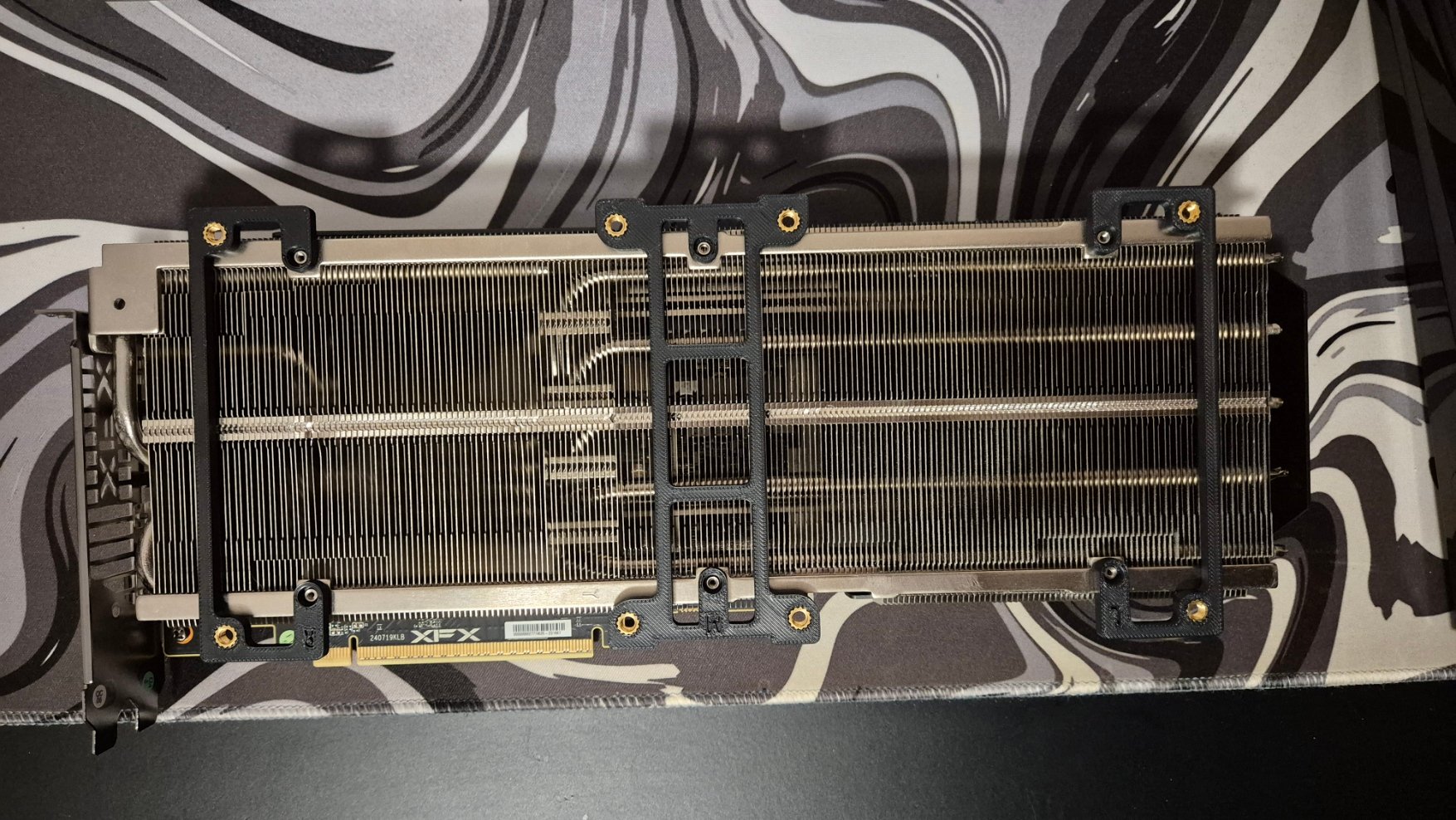 Mit der jetzigen Performance bin ich sehr zufrieden. Die Karte ist unter Volllast und der alten Lüfterkurve deutlich leiser (max. 40% Drehzahl, max. 69°C Hotspot). Bei max. 50% Drehzahl ist sie gefühlt immer noch leiser als mit den Standardlüftern, allerdings liegt der Hotspot bei nur noch ca. 61°C. Betrieben wurde die Karte dabei mit einem Spannungsoffset von -50mV und einer Leistungsgrenze von -10% (ca. 200 Watt Leistungsaufnahme).
