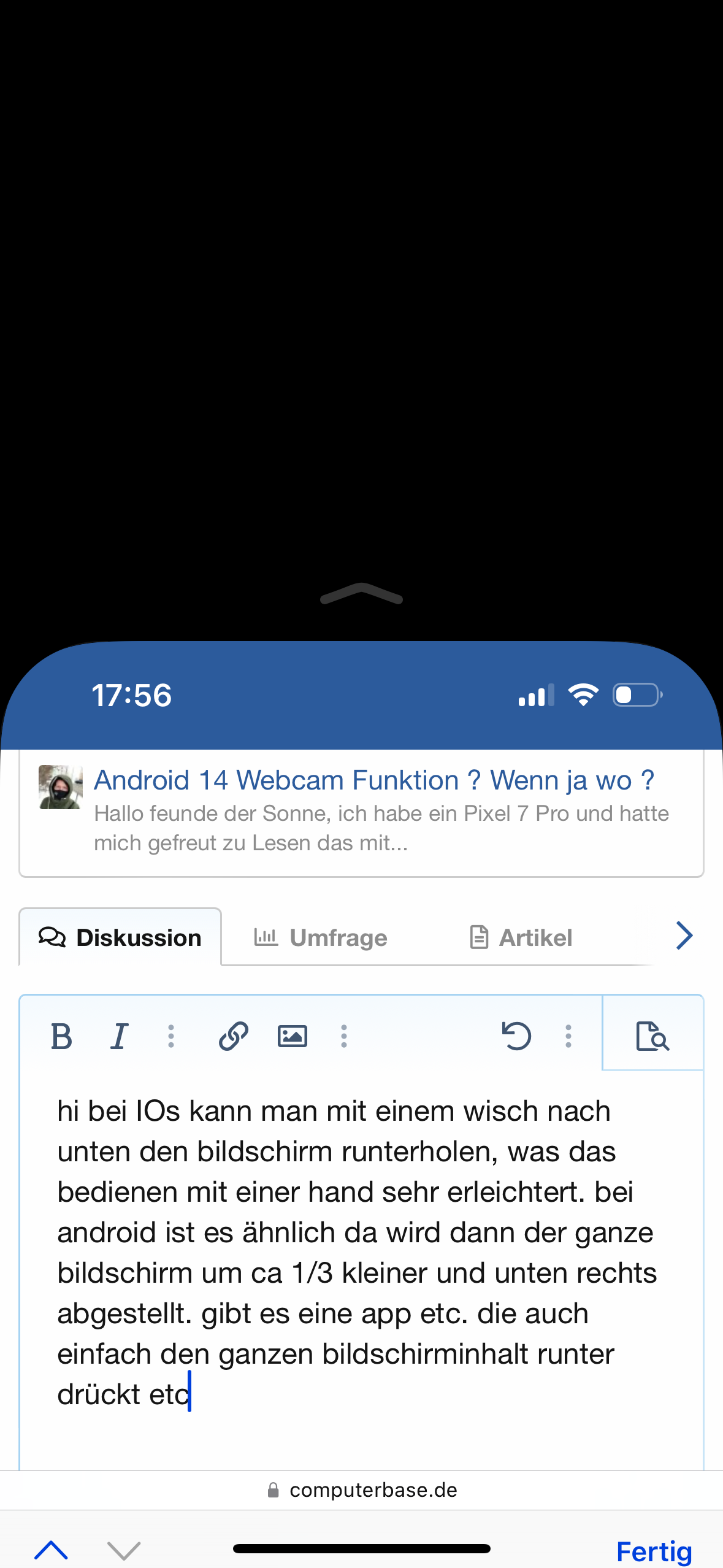 hi bei IOs kann man mit einem wisch nach unten den bildschirm runterholen, was das bedienen mit einer hand sehr erleichtert. bei android ist es ähnlich da wird dann der ganze bildschirm um ca 1/3 kleiner und unten rechts abgestellt. gibt es eine app etc. die auch einfach den ganzen bildschirminhalt runter drückt etc. siehe anlage