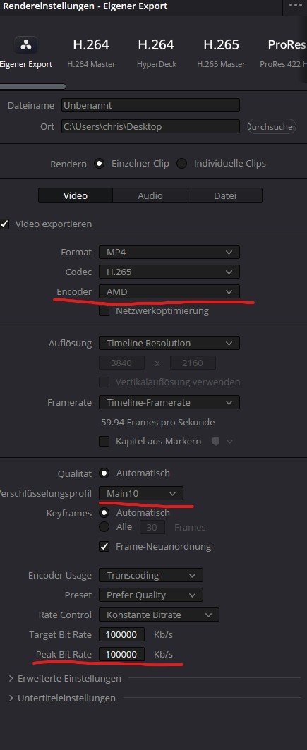 Ich Versuche seit Stunden die passende Export Einstellungen für meine Videos zu finden und so langsam glaube ich es liegt an meiner AMD RX9070 XT Grafikkarte. Ich kann beim Format MP4 in H265 Videos in 10 Bit nicht über 100.000 kbits einstellen. Ich komme nur über die 100 Mbits wenn ich den Encoder auf Nativ Stelle, dann kann ich unter Verschlüsselungsprofil aber nur noch MAIN einstellen (also 8 bit Ausgabe) kann das mal jemand testen der eine Nvidia GPU hat?