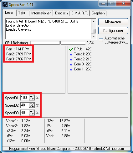 Die angeschlossenen PWM Lüfter drehen immer 100% und das ist verdammt schnell und laut, denn die schaffen 2800 U/min.