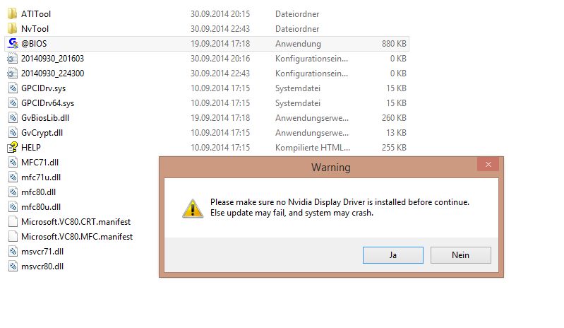 1. Als ich das VGA @Bios starten wollte (wollte einfach mal reinschauen - hatte das Programm bei der 770er vorher übersehen) kam eine Meldung, die sinngemäß hieß, wenn ich die NVIDIA Treiber installiert hätte, könnte das Ausführen des Programmes zu Freezes führen. Da ich die ja drauf hatte, klickt ich also auf Nein, es öffnete sich ein CMD-Fenster und mein PC freezte. Derart hart, dass noch nicht einmal der Reset-Schalter was brachte. Was zum Henker soll das und was passiert da?