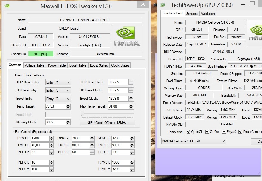 Wie ich schon geschrieben habe, habe ich meine G1 in Verbindung mit einem Intel Xeon (E3-1230 v3 ohne iGPU) geflasht. Den Treiber musste ich nicht deinstallieren nur die Grafikkarte im Gerätemanager deaktivieren und nach dem Flashvorgang einmal den PC neu starten. Benutzt wurden Maxwell II Bios Tweaker 1.36, NVFlash 5.196 und zum BIOS auslesen GPU-Z 0.8.
