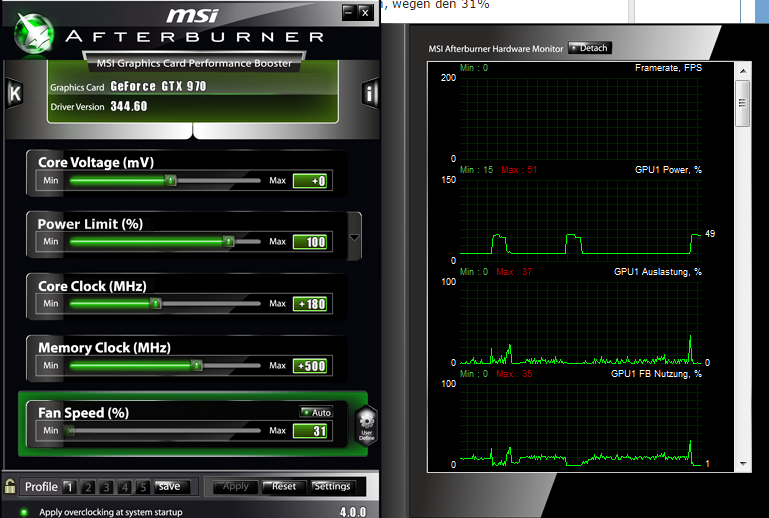 Habe die Prozent links auf 10 gelassen un bei den RPM01 mal 1000 eingetragen --> Nun lassen siech die Lüfter auf 31% stellen und laufen auf 1000 Umdrehungen ohne Probleme. Hänge einen Screenshot vom Afterburner an, wegen den 31%