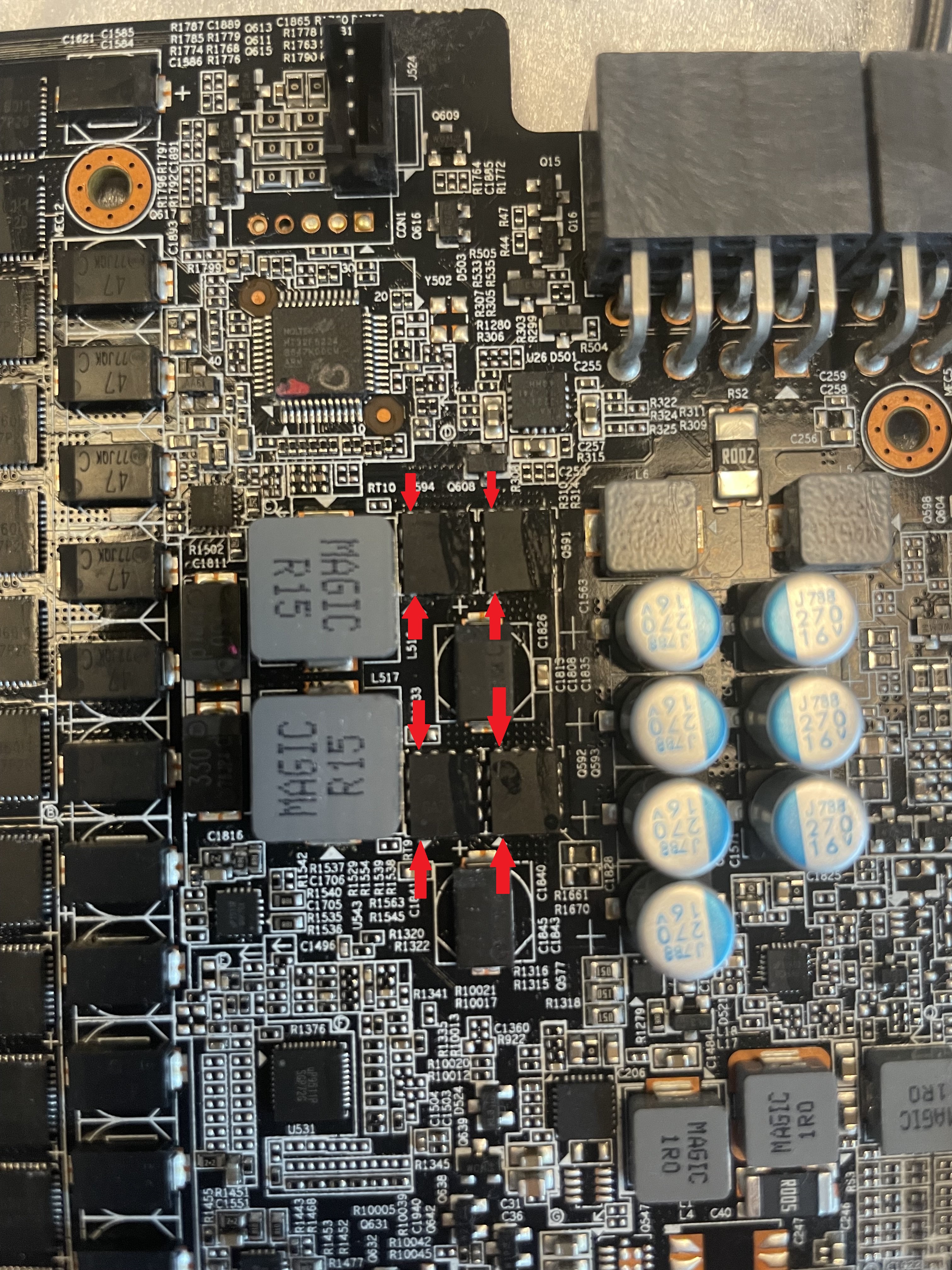 Mit dem rechten, meinte ich den rechten Mosfet. Du hattest ja den linken Mosfet markiert, ich habe diesen und den rechts daneben gemessen, der an Pin 1 die 1,8 Ohm anzeigte.AssassinWarlord schrieb:edit mit Durchgang meinst du unedlich hoher widerstand? also messgerät zeigt dann nix mehr an?