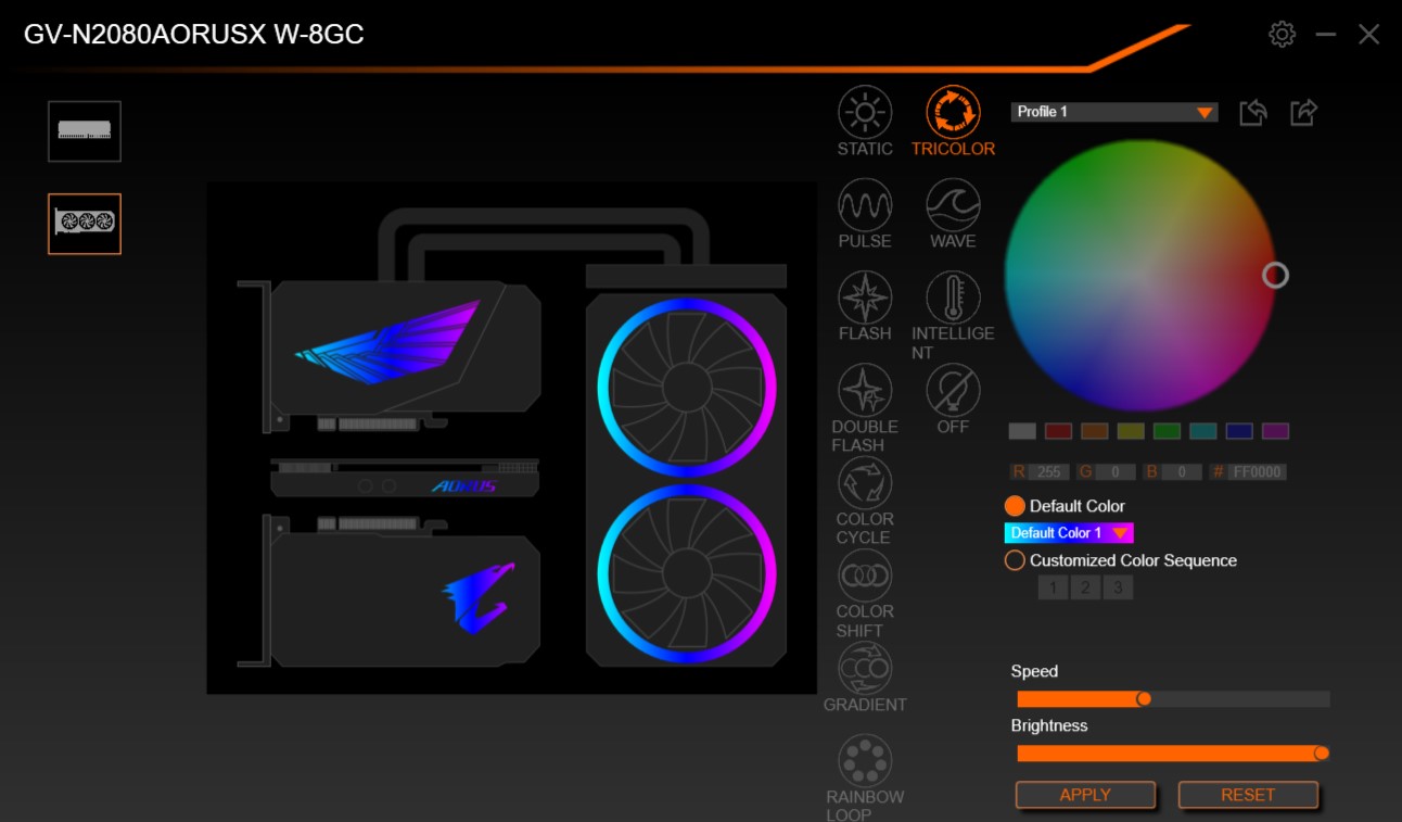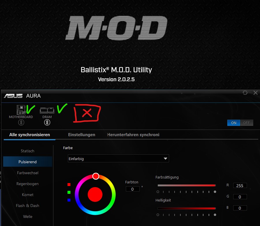 Keine Probleme im Solo-Betrieb. Wirklisch schöne Effekte, die sanft und flüssig laufen. Harte Farb- oder Effekt-Sprünge wie es oft in der Budget-Klasse (Crucial Ballistix Tactical hust hust) anzutreffen ist, muss man hier nicht ertragen. Eine Hersteller-Interne Synconisation zu Gigabyte Boards oder der Gigabyte-AiO konnte ich mangels Hardware leider nicht testen. Die ASUS Software AURA SYNC (Armoury Crate) konnte nur die LEDs der Ballistix-RAM Riegel assimiliren, aber die Graka bleibt verborgen. Anders herum findet die Gigabytes RGB Fusion 2.0 ebenfalls die Ballistix-RAM Riegel, nicht aber die Mainboard Beleuchtung oder die Lüfter-LEDs die am Mainboard hängen.