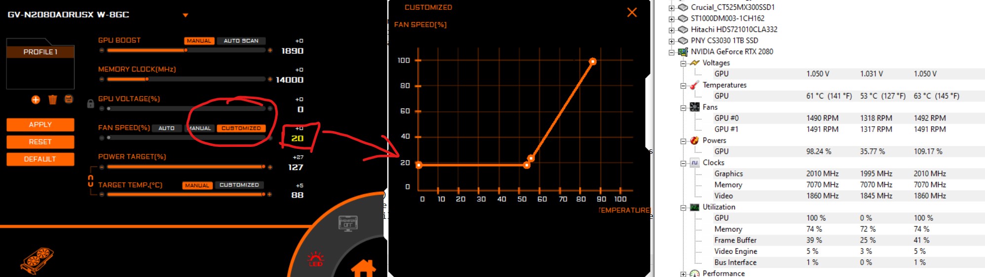 Ich war es gewohnt beim Start des PC’s fast nichts zu hören. Zeiten der himmlischen Ruhe sind mit der AORUS GeForce RTX 2080 XTREME WATERFORCE endgültig vorbei. Bereits beim Systemstart, drehen die Lüfter auf 100% auf und halten für mehrere Sekunden Vollgas. Es erinnert ein wenig an pubertäres Verhalten von Führerschein-Frischlingen an der Ampel, wenn sie (in Papa‘s Auto) zeigen wollen wie „fett“ der Sound ist. Danach geht es runter auf einen halbwegs erträglichen Geräuschpegel. Deutlich hörbar und wesentlich Lauter als jede luftgekühlte Karte wie ich anmerken will. Ist der Systemstart überstanden und Windows gebootet, übernimmt die Software Steuerung und drosselt auf 20% Leistung runter. Leise? Haha... nein. Meine alte GTX1080 schaltet im Idle die Lüfter aus. Fieser Vergleich. Trotzdem muss die Schelte sein: Warum zur Hölle gibt es keinen Idle fanless Status? Das Ding röhrt nonstop und man kann nichts dagegen tun. Sorry Gigabyte, das ist ein no go!