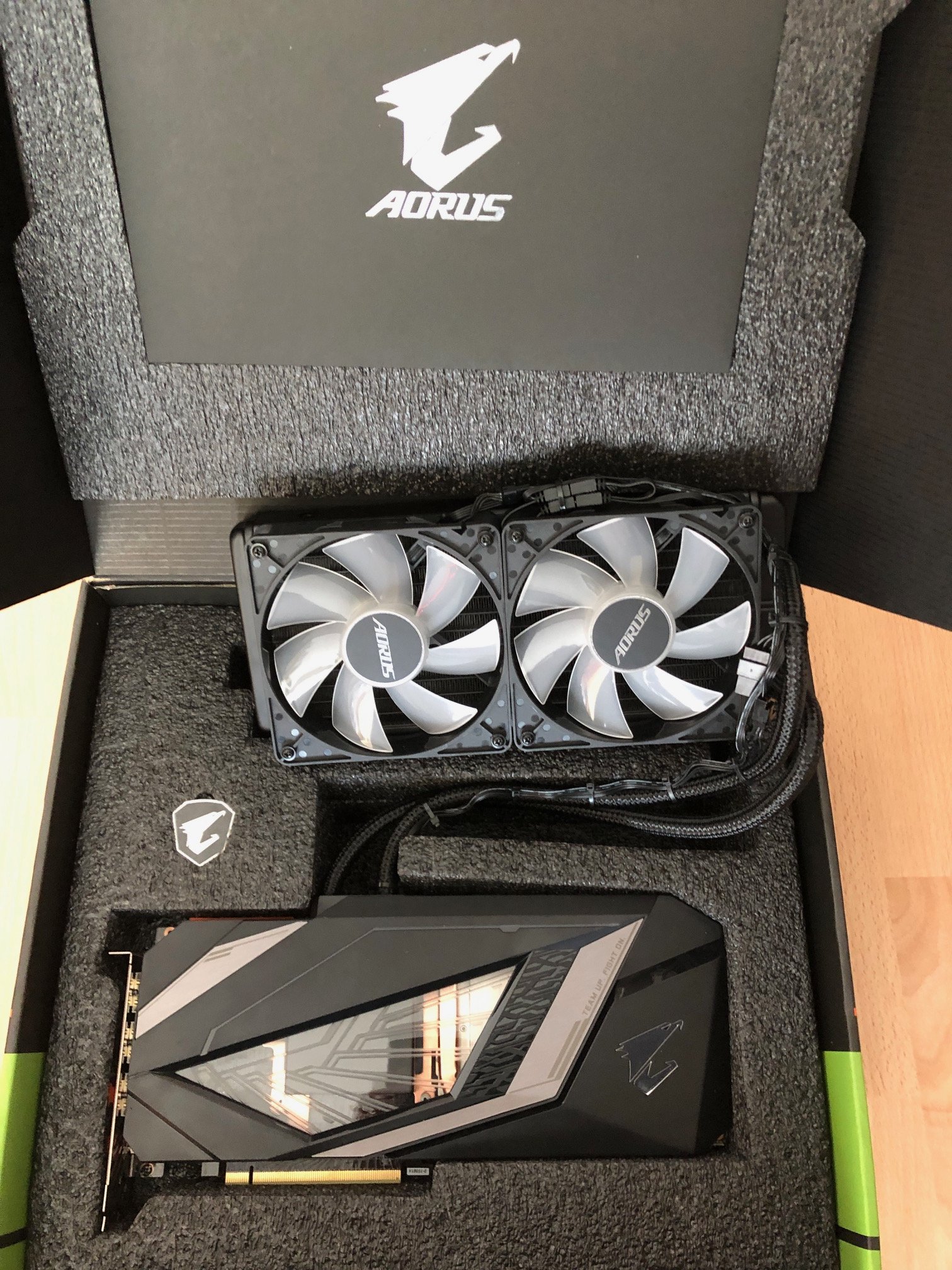 Der Radiator ist sehr kompakt und wird auch ungeübten Händen keine Probleme bereiten, sofern das Gehäuse den nötigen Platz bietet. Und ja, es sieht toll aus! Das ist die erste Karte wo ich es bedauere kein Riser-Kabel hier zu haben um sie auf zu stellen. Einfach Hammer! Besonders hervor heben möchte ich hier neben der grandiosen, gleichmäßigen Beleuchtung, das Sichtfenster auf den GPU-Waterblock. Die Verarbeitung ist hervorragend und trotz Hartplastik-Schild fühlt es sich sehr wertig an. Beim Anfassen gibt nichts nach oder verbiegt sich, wie es bei preiswerten Kandidaten durchaus passieren kann.