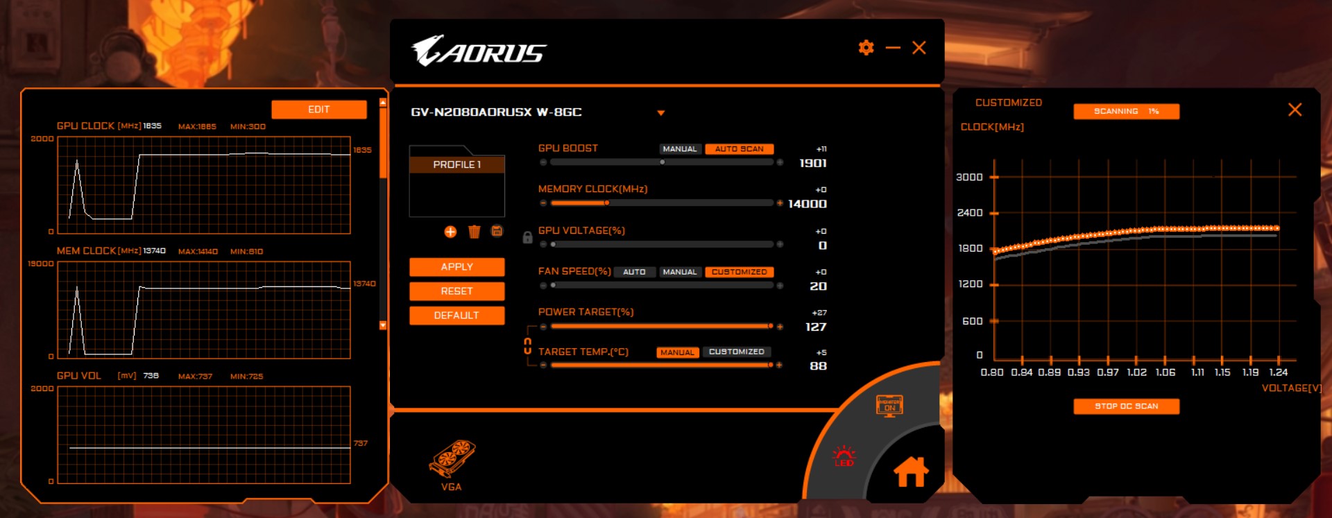 Die Software unterstützt ein automatisches OC mit GPU-Takt, Speicher-OC und Spannungserhöhung. Der Prozess dauert eine Viertelstunde und tastet sich schrittweise an die maximalen Taktraten heran. Wird es instabil, erhöht das Programm die Spannung und testet erneut mit mehr und mehr Takt, bis wieder an der Spannungsschraube gedreht wird. Ziemlich beeindruckend wenn man bedenkt wie viel Zeit sonst beim manuellen Tuning drauf geht. Hier läuft alles in einer Kaffeepause.