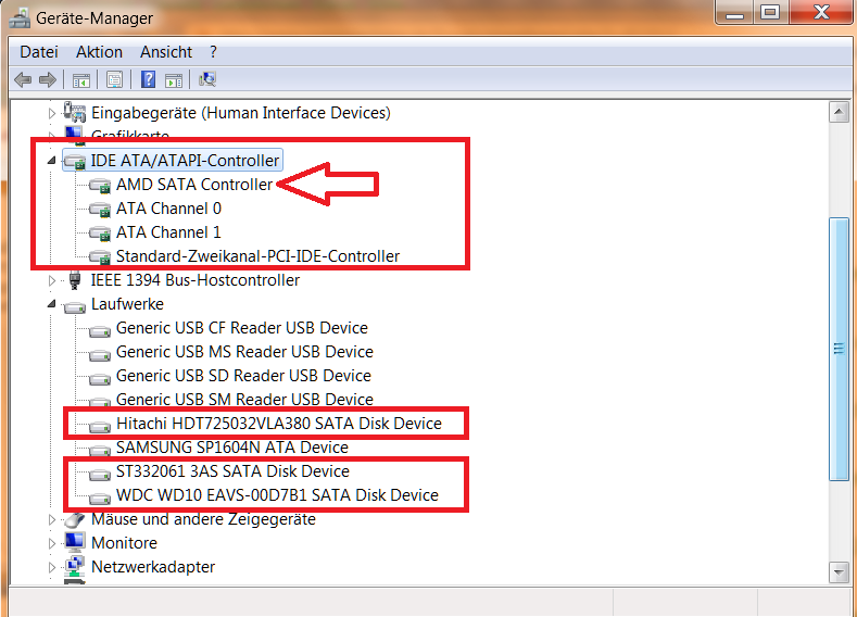 Im Gerätemanager steht unter IDE ATA/ATAPI Controller auch nix von AHCI. Nur AMD SATA Controller; ATA Channel 0 & 1 sowie Standart Zweikanal PCI IDE Controller.