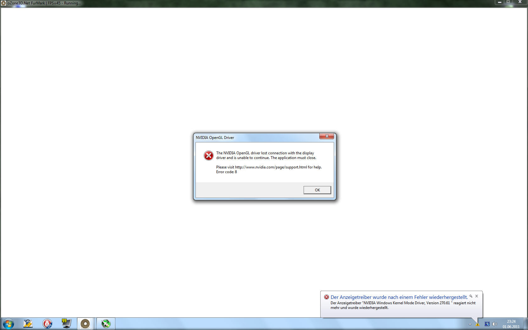 ich habe mir heute eine Gygabyte GTX 560 Ti OC gekauft, habe sie eingebaut und Treiber installiert. Soweit so gut. Sie ist sehr leise und auch beim spielen ( Mafia, Crisis, diverse 3Dmarks) lief alles gut. Als ich den furmark 1.8 laufen lasse verabschiedet sich der Treiber mit der Meldung Error code 8 und auch Unigine 2.5 Hängt sich auf, aber so das ich den Rechner neistarten muss. Weiss jemand ob die Karte defekt ist, oder es an den furmark und Unigine liegt. sonst bringe ich sie lieber zurück. Wie gesagt Mafia und auch Crisis laufen stundenlang ohne Probleme.