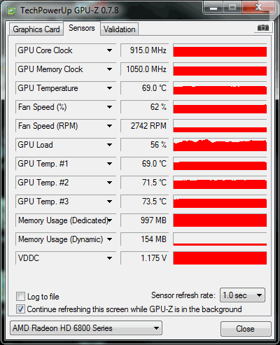Habe folgendes Problem,denn ich glaube meine 4 Jahre alte Gigabyte HD 6870 Grafikkarte wird sich demnächst verabschieden.Die Temperatur geht beim zocken bis 70C was ansich nichtmal schlimm ist aber der Lüfter macht mich irre,habe mal mit GPU-Z einen Screenie gemacht und ich hoffe ihr könnt mir sagen ob ich mit meiner vermutung richtig liege