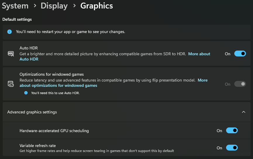 Etwas irritiert mich jedoch. In den Windows Anzeigeeinstellungen steht bei VRR, dass es nicht unterstützt werde. Die Monitor-Firmware habe ich bereits auf F06 aktualisiert, VRR ist im OSD eingeschaltet und der HDR-Treiber von Gigabyte ist ebenfalls installiert. Der Screenshot (angefügt) zeigt, was ich meine.